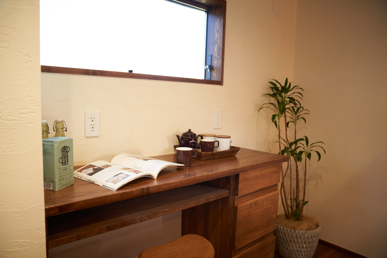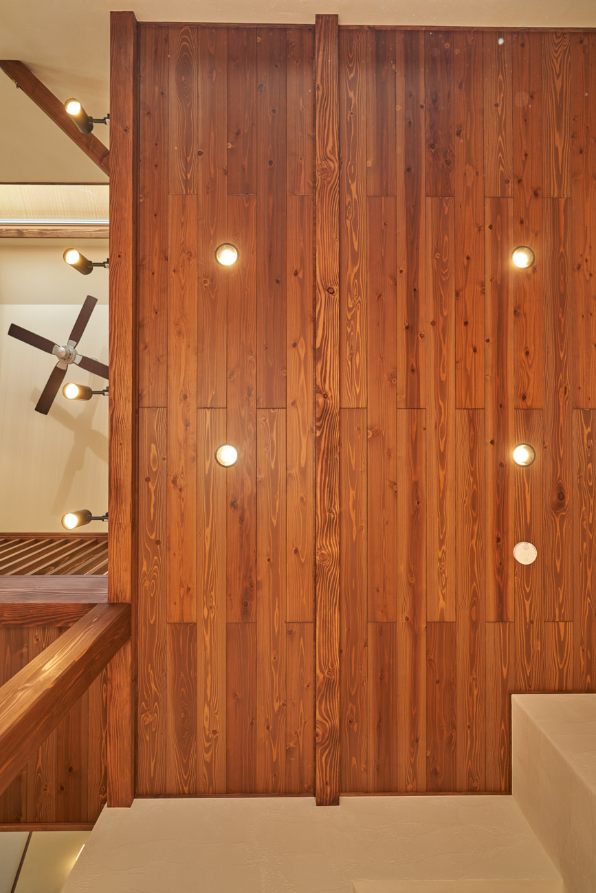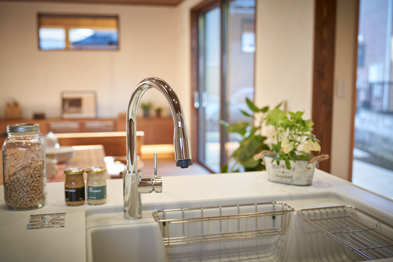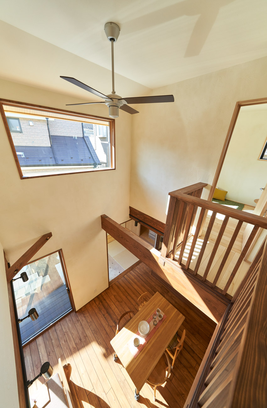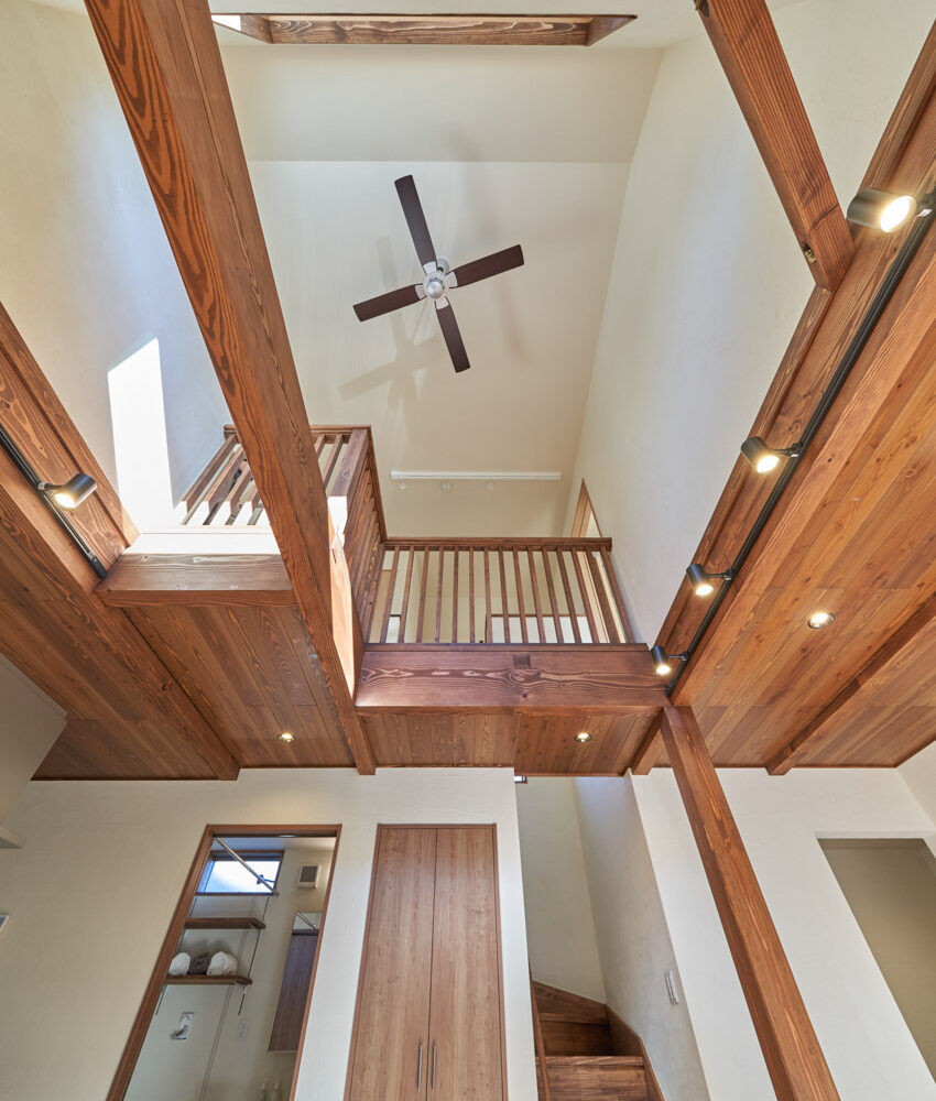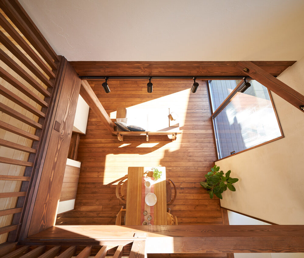 昔ながらの色や素材を使い、随所に趣深さを。中心に吹き抜けを配置し、高低差のインパクトと吹き抜けからの明るさで広さを体感できます。天井まで無垢板を使用した美しい内装仕上げ。大きなアイランドキッチンを中心に家事ができるよう、キッチン横には家事室にも育児スペースにも衣装収納にもなる和室を設置。そのままウッドデッキへも出られます。