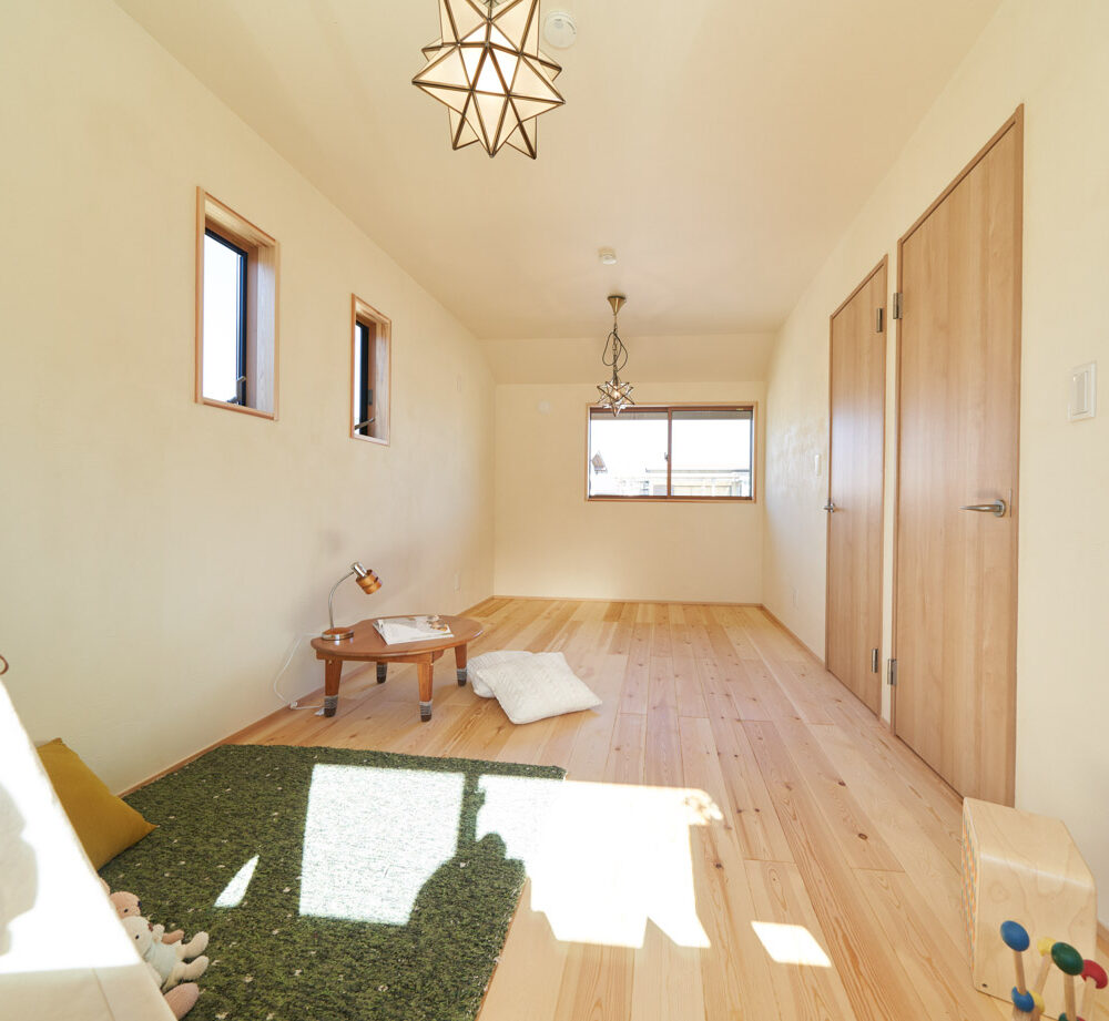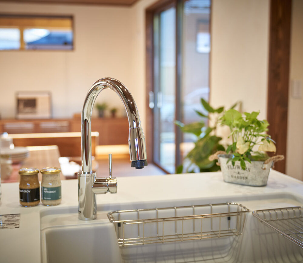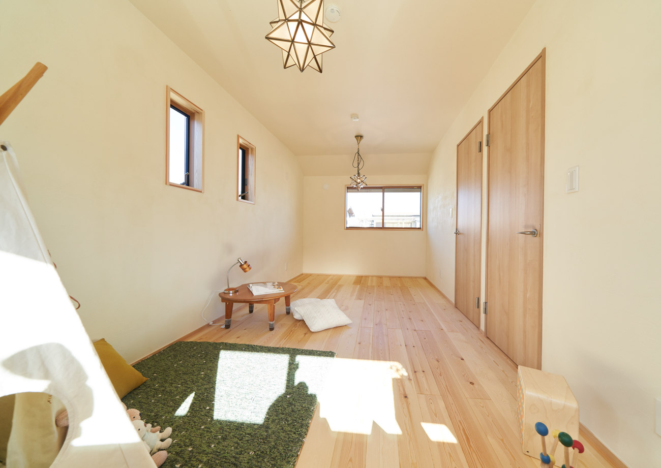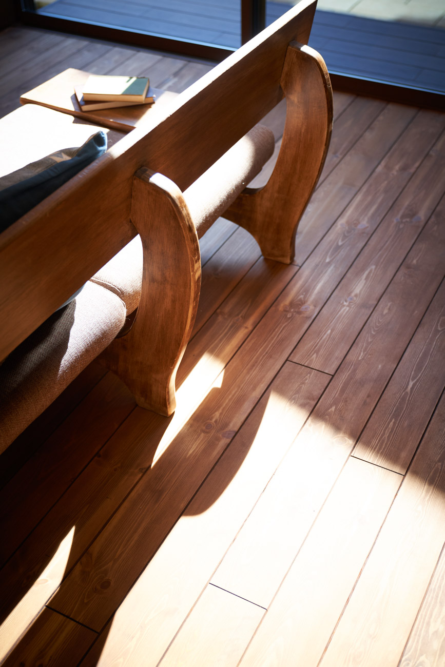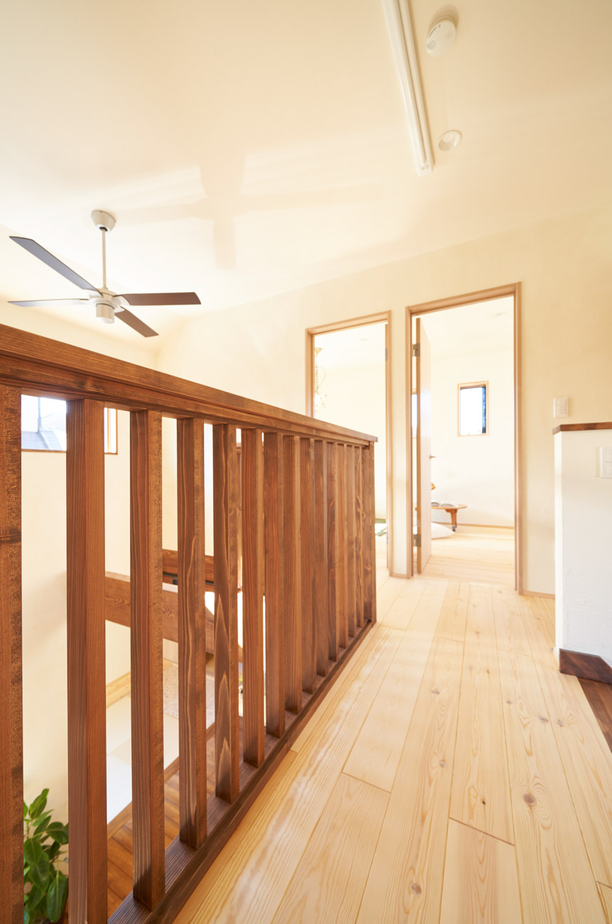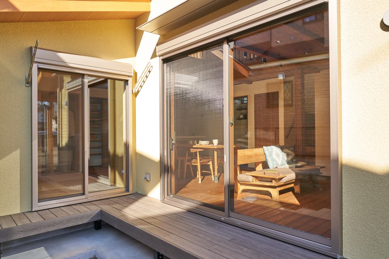 昔ながらの色や素材を使い、随所に趣深さを。中心に吹き抜けを配置し、高低差のインパクトと吹き抜けからの明るさで広さを体感できます。天井まで無垢板を使用した美しい内装仕上げ。大きなアイランドキッチンを中心に家事ができるよう、キッチン横には家事室にも育児スペースにも衣装収納にもなる和室を設置。そのままウッドデッキへも出られます。