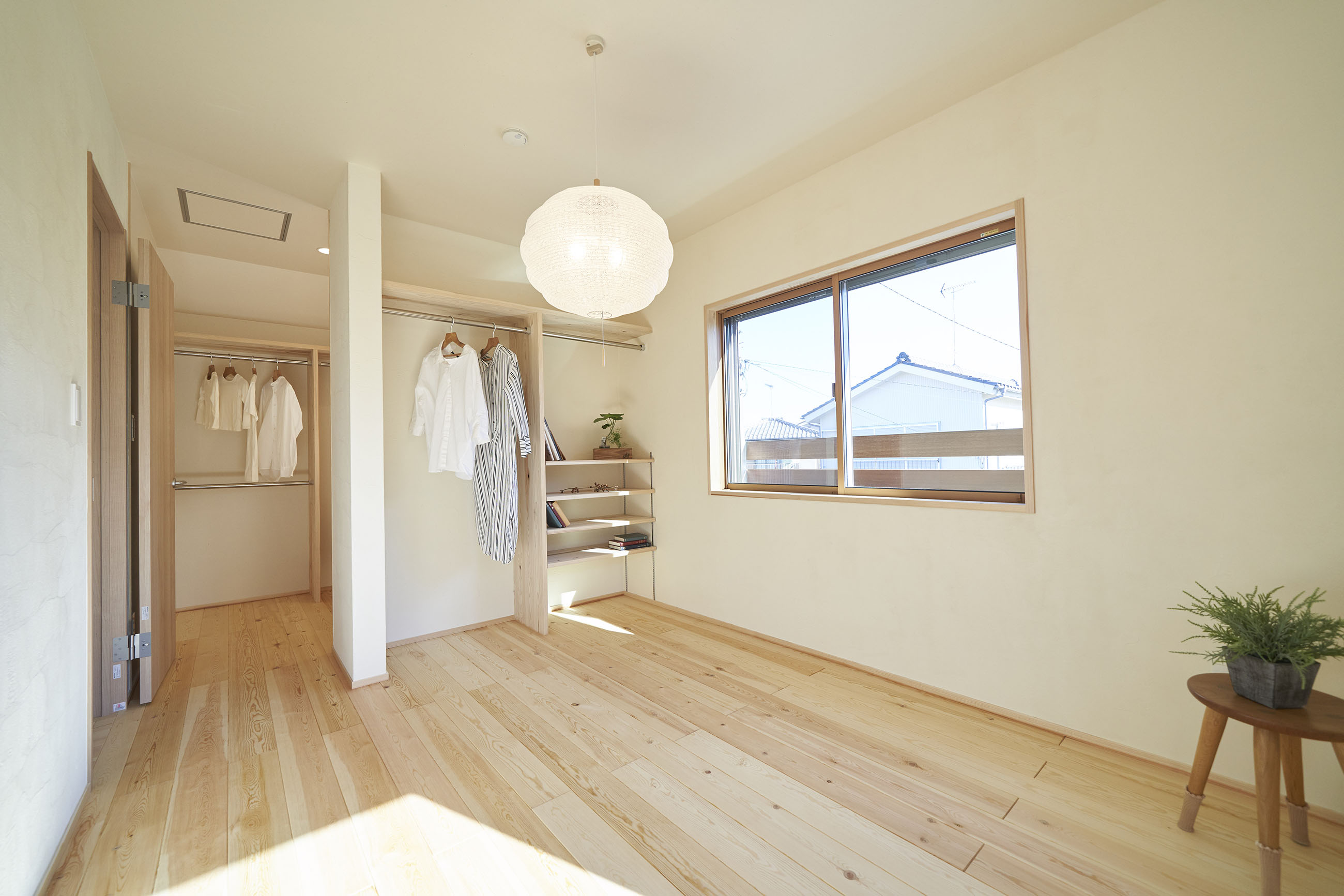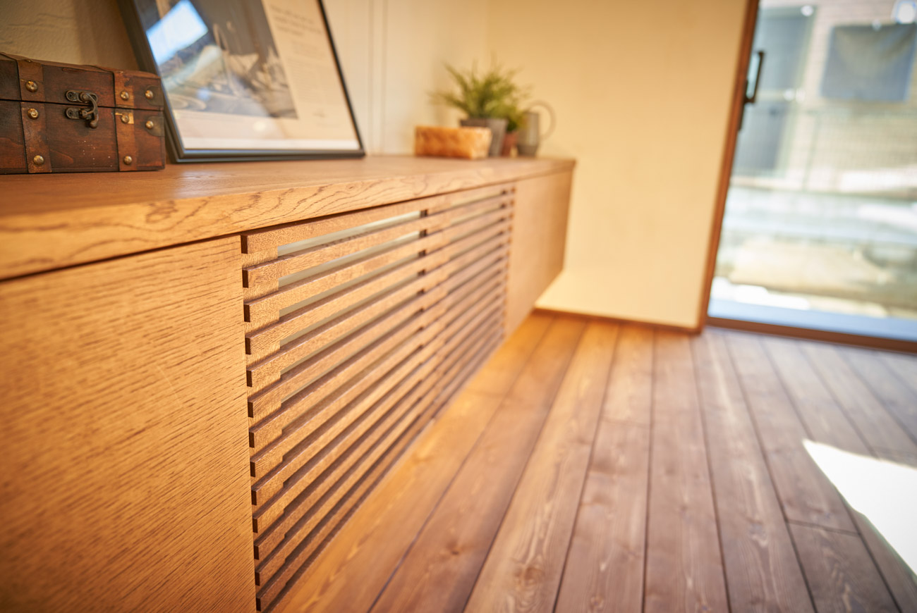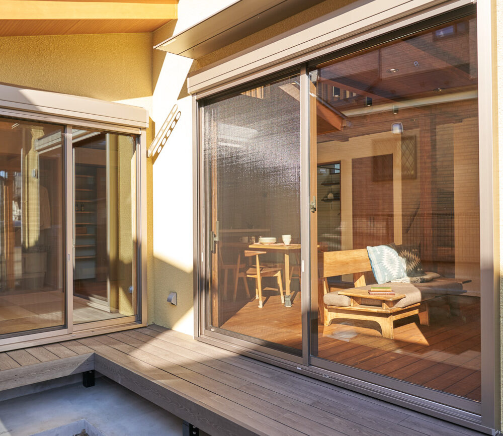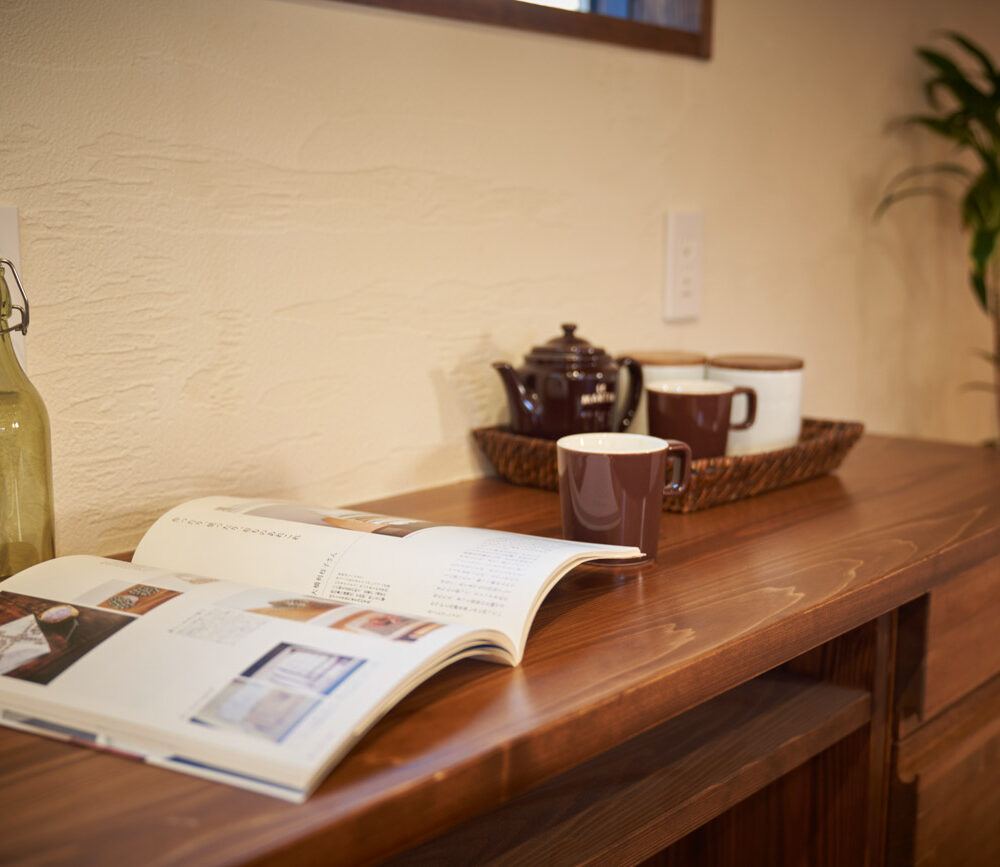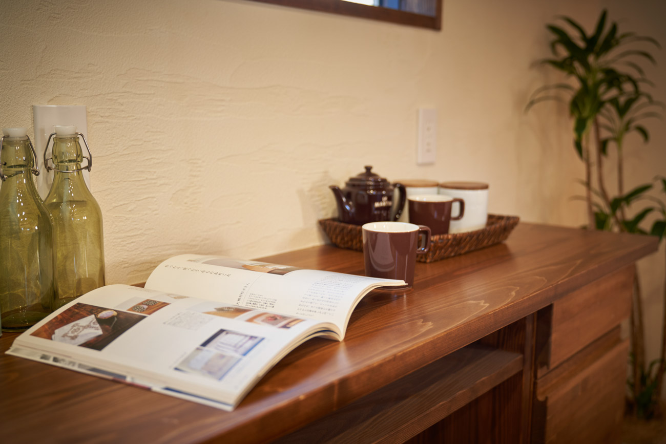 昔ながらの色や素材を使い、随所に趣深さを。中心に吹き抜けを配置し、高低差のインパクトと吹き抜けからの明るさで広さを体感できます。天井まで無垢板を使用した美しい内装仕上げ。大きなアイランドキッチンを中心に家事ができるよう、キッチン横には家事室にも育児スペースにも衣装収納にもなる和室を設置。そのままウッドデッキへも出られます。