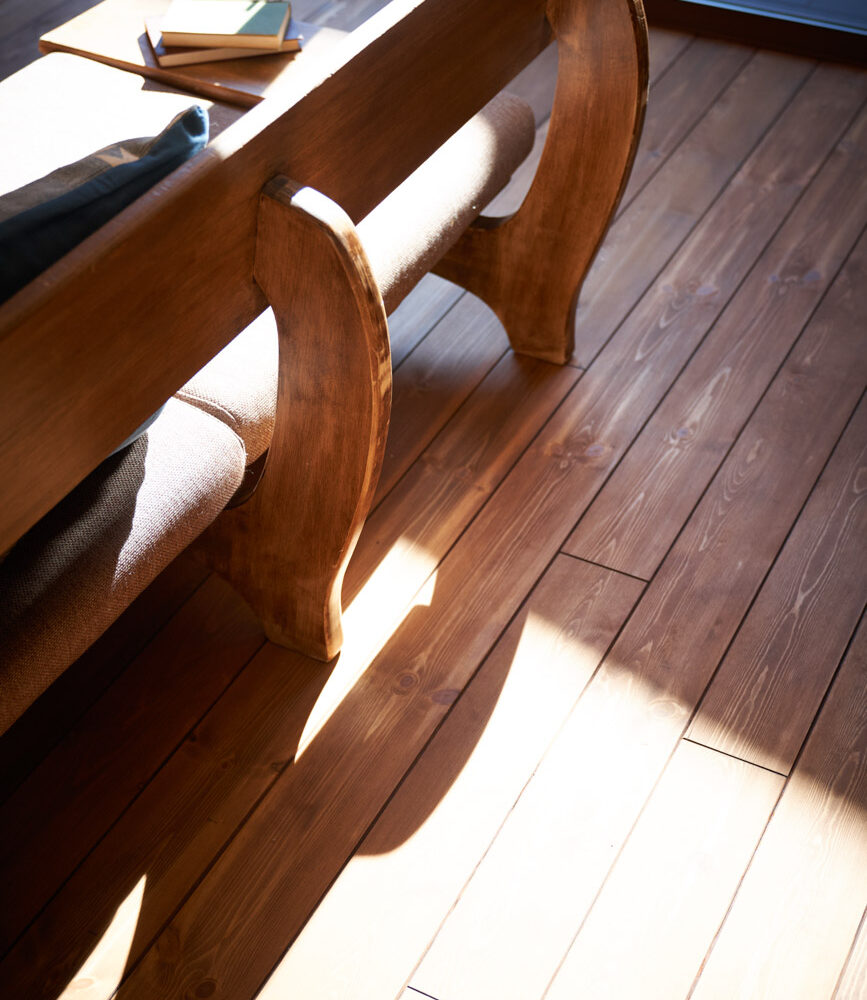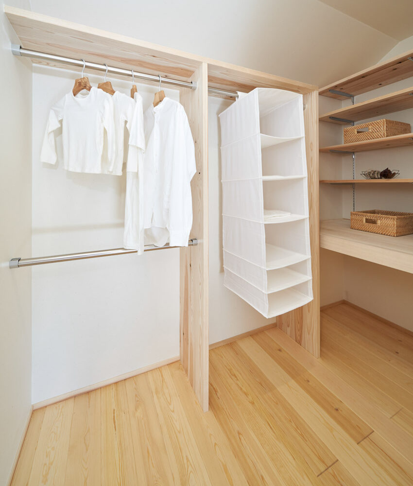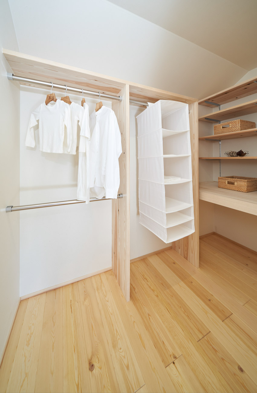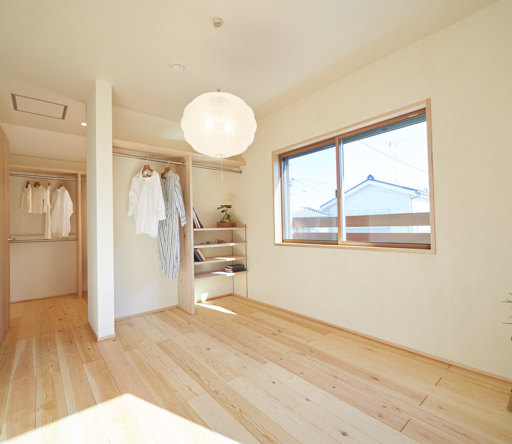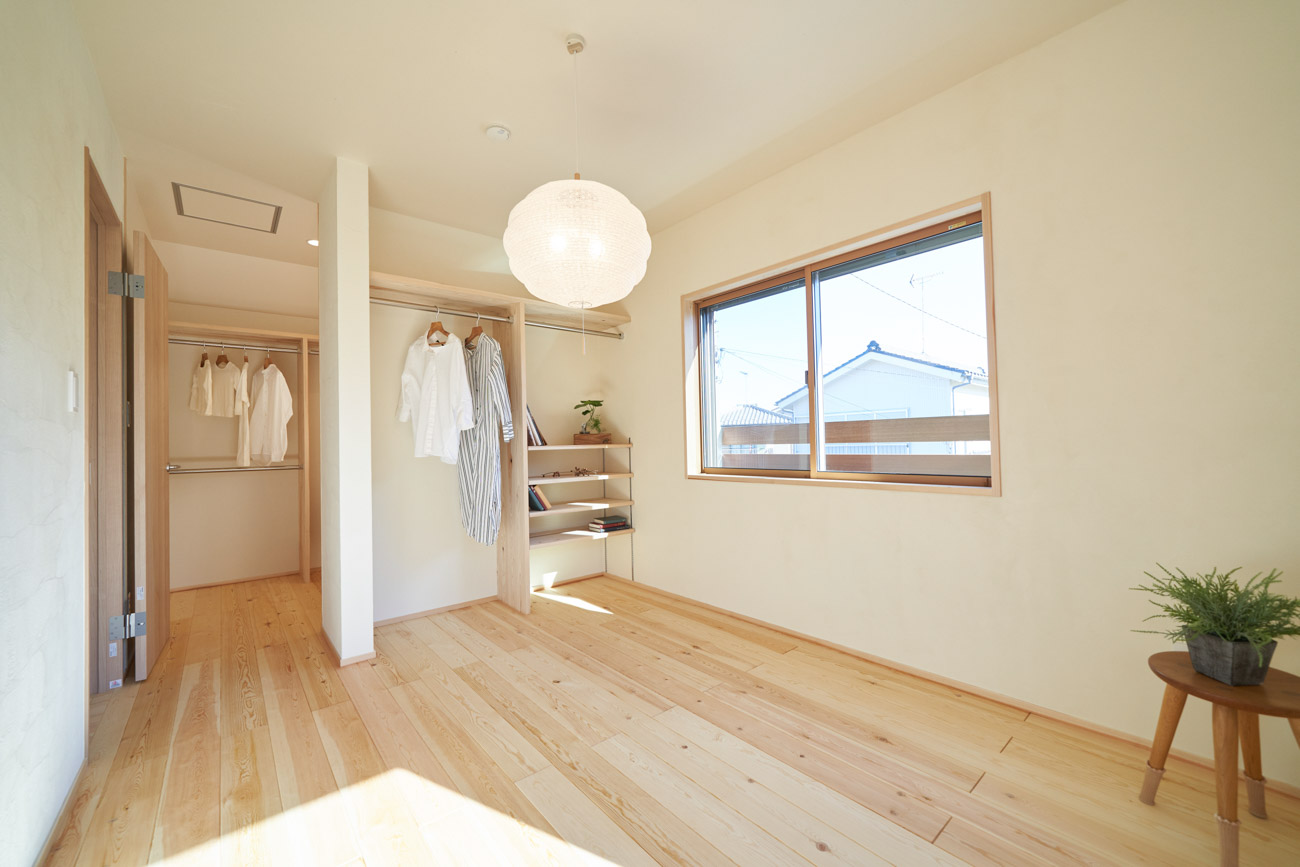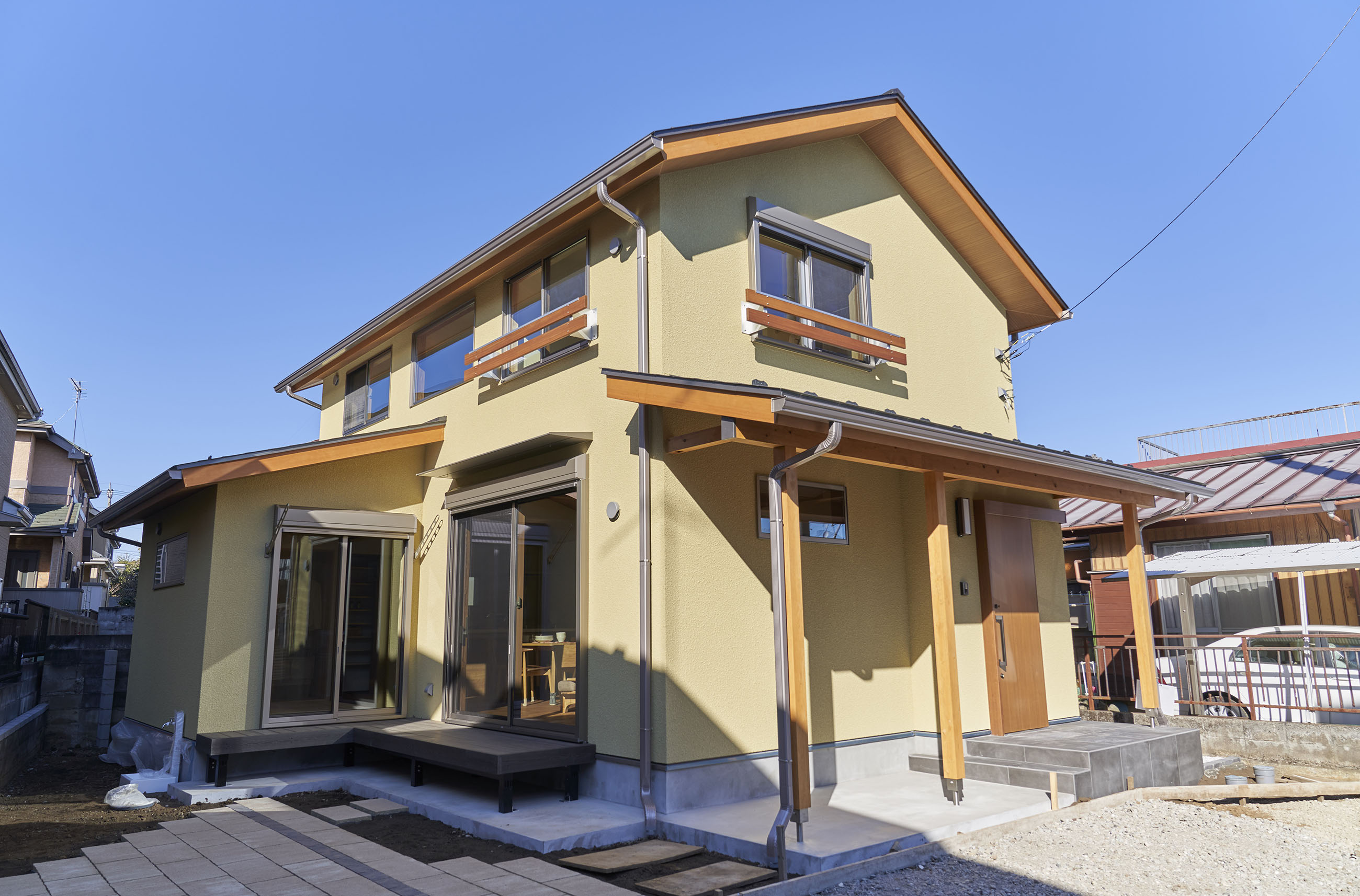 昔ながらの色や素材を使い、随所に趣深さを。中心に吹き抜けを配置し、高低差のインパクトと吹き抜けからの明るさで広さを体感できます。天井まで無垢板を使用した美しい内装仕上げ。大きなアイランドキッチンを中心に家事ができるよう、キッチン横には家事室にも育児スペースにも衣装収納にもなる和室を設置。そのままウッドデッキへも出られます。