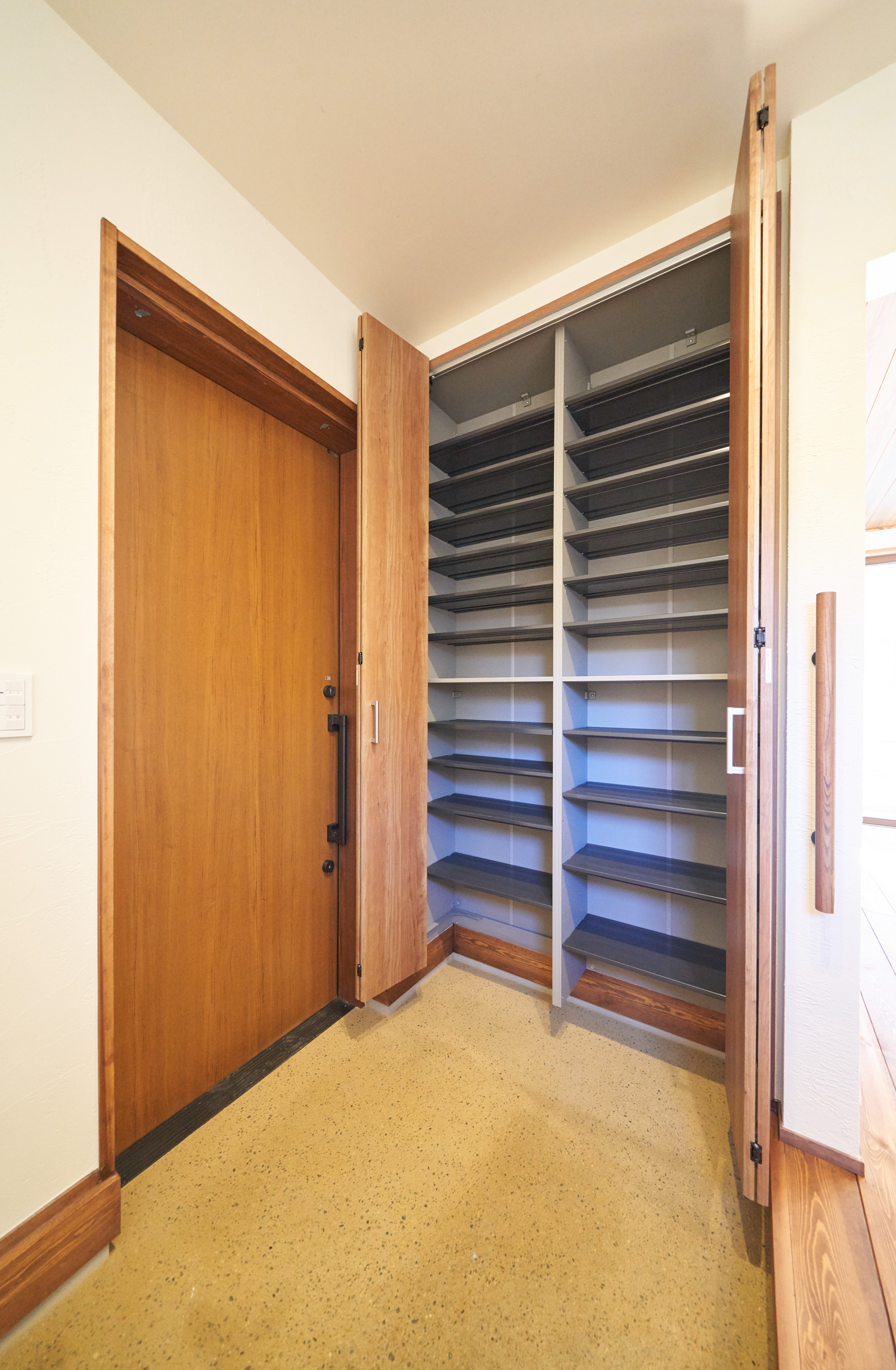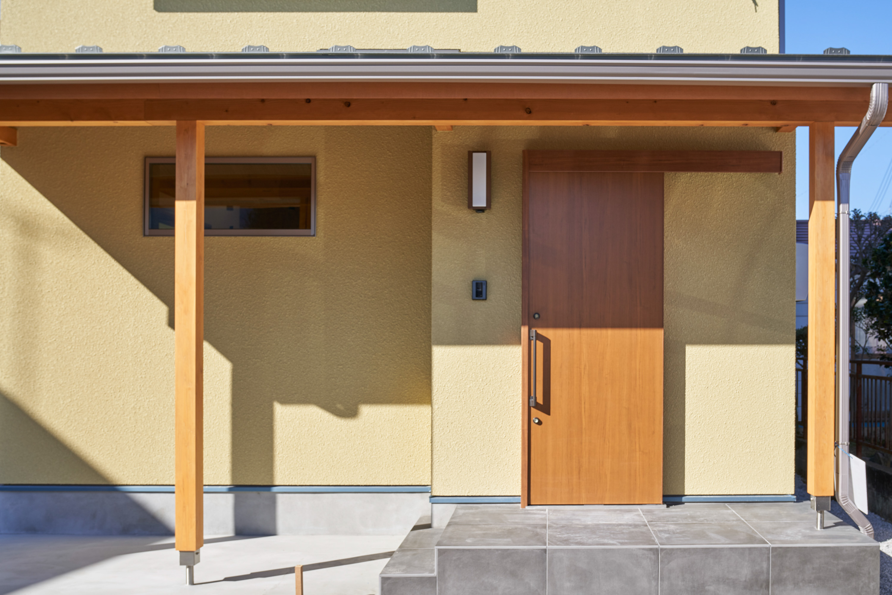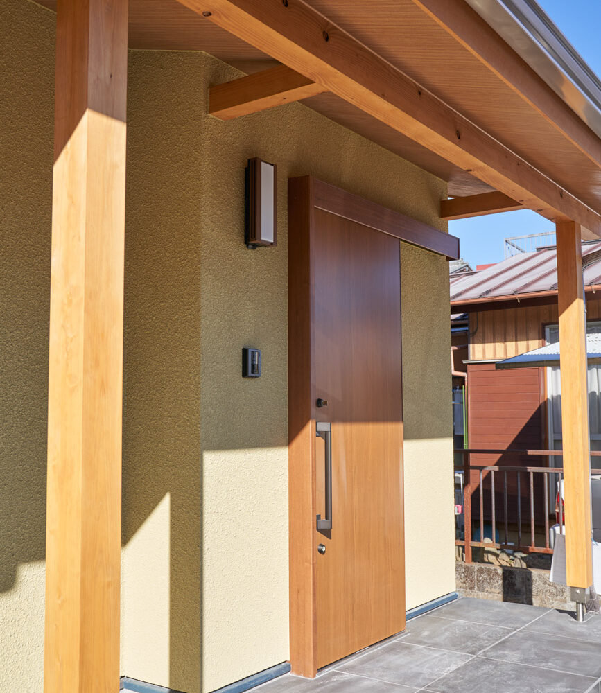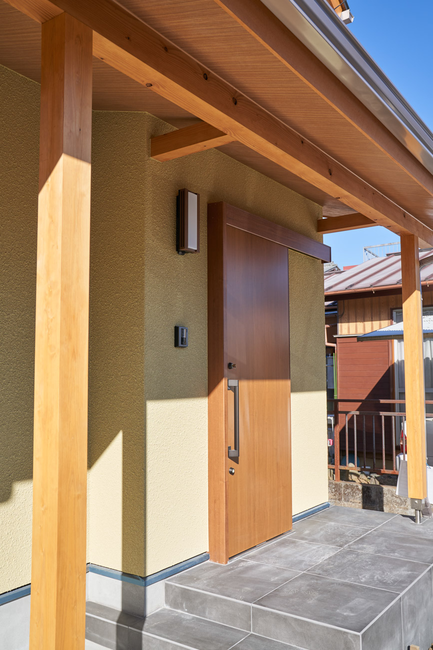 猫柳色の左官仕上げの壁と木製引き戸という、素敵な和風住宅の外観に。玄関外には60角大判タイルを、玄関内はかき落としの三和土を採用いたしました。