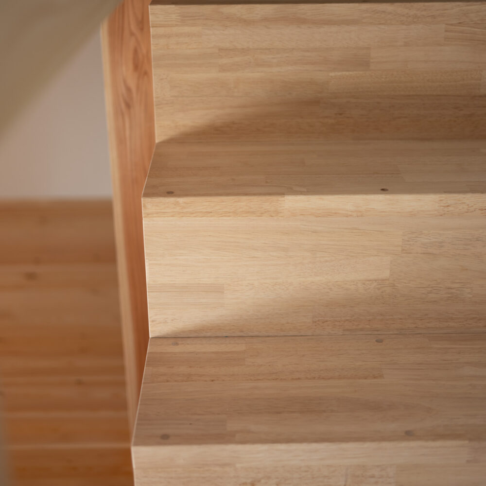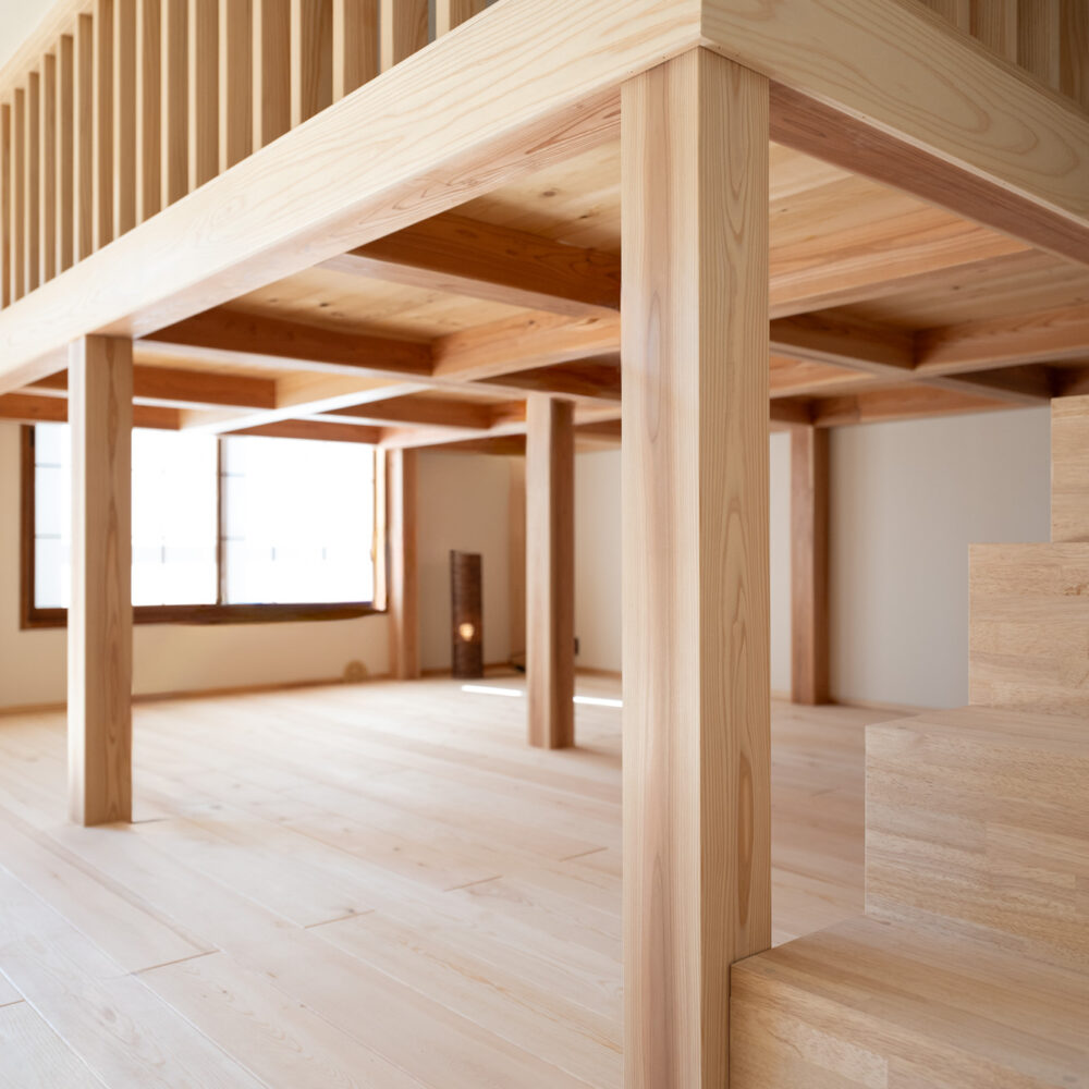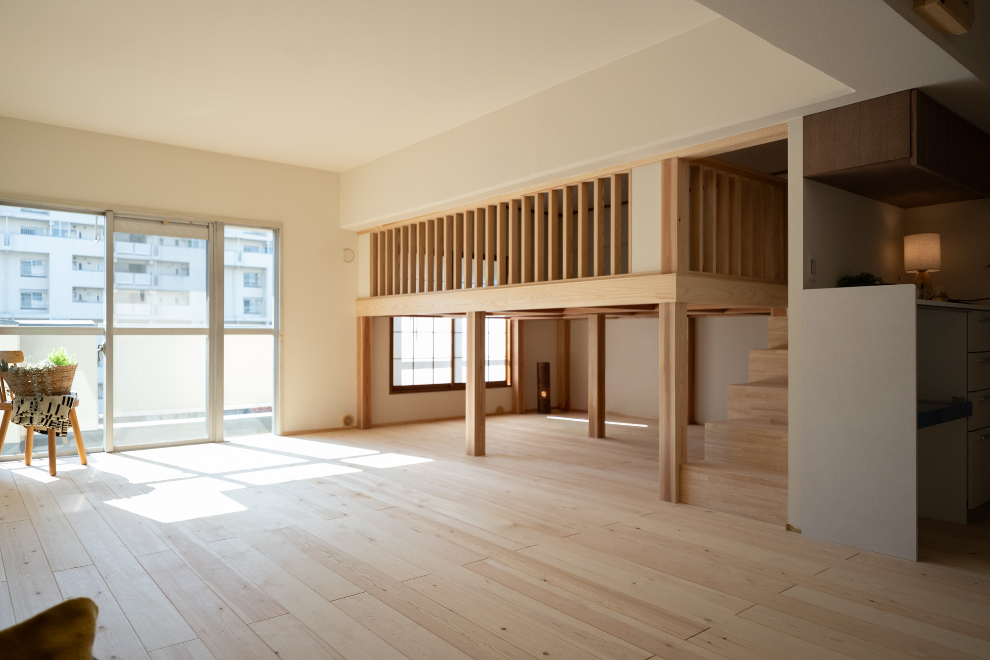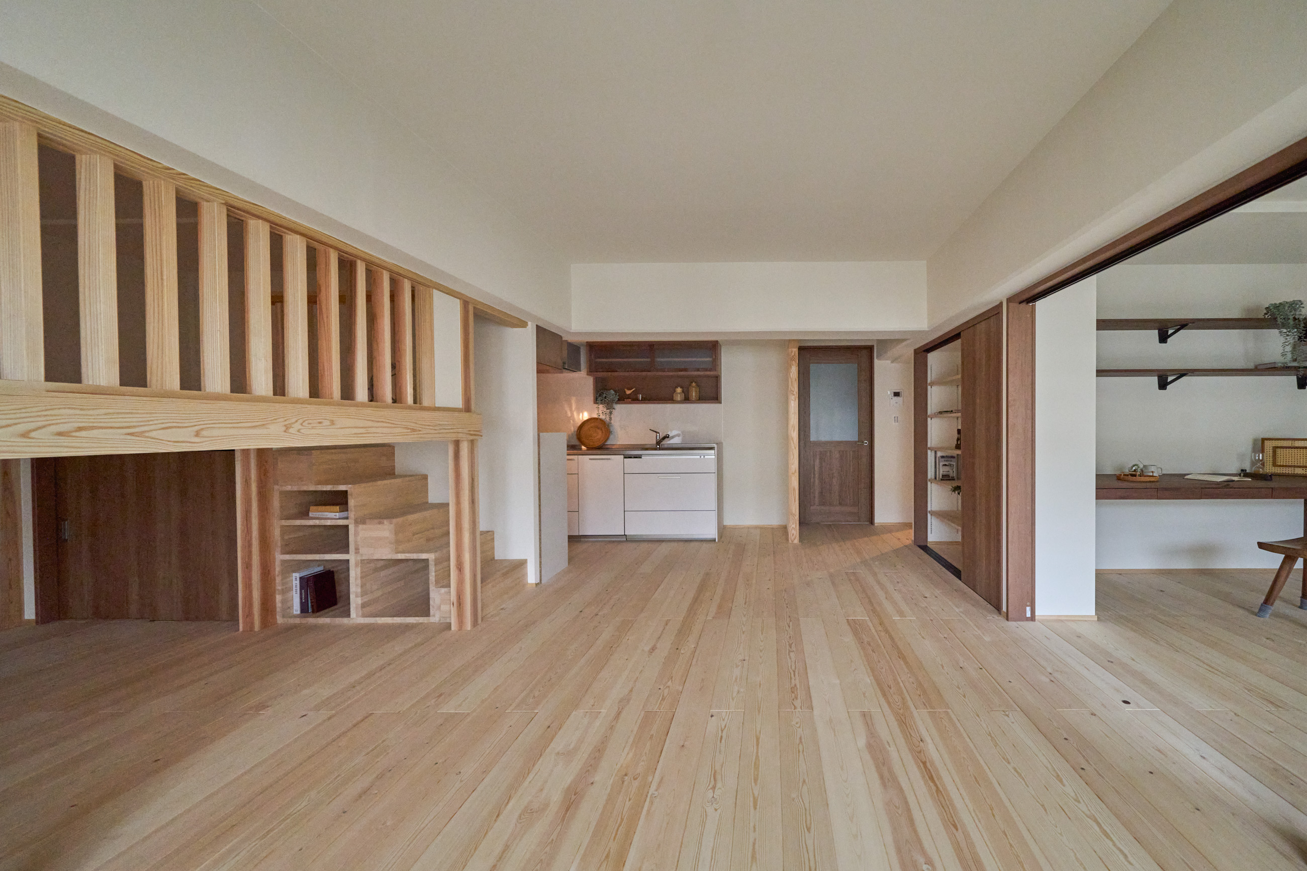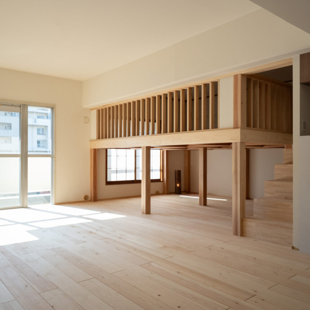 築40年以上のマンションを、自然素材と立体デザインで再生したフルリノベーション。かつての3DKは、広がりを感じる2LDK+ヌック+大容量クローゼットへ。主寝室は、旅先で心に残った“ロフトベッド”のある宿から着想を得て、上をベッドルーム、下をヌックとした立体構成に。格子の手すり越しにリビングを見下ろす視線の抜けが、コンパクトな空間に心地よい広がりを生み出します。 お洋服が好きな施主様のために、北側の一室はまるごとクローゼットに。さらに、子ども部屋の造作デスクやキッチンの吊り戸棚など、シムラが得意とする造作アイテムを随所に設け、機能と美しさを両立。時を重ねた建物に新しいぬくもりを与えています。 注文住宅のシムラが手がけたマンションリノベーション。自然素材や間取りの工夫で自分たち好みの暮らしに合った住まいへと大変貌を遂げました。 思い切った上下段の発想。 旅先で心に残った“ロフトベッド” 建主様が旅先で訪れたホテルで採用されていたロフトベッド。限られた空間を最大限活用するための方法として、とても有効なアイデアでした。上段のベッドは暗くならないようリビングとの仕切りに格子を設置。下段は大容量の収納にもなるヌックスペースに。階段部分はブックシェルフにもなる遊び心の楽しい空間です。