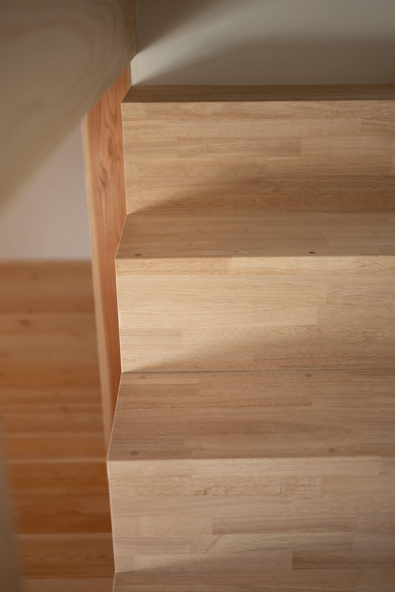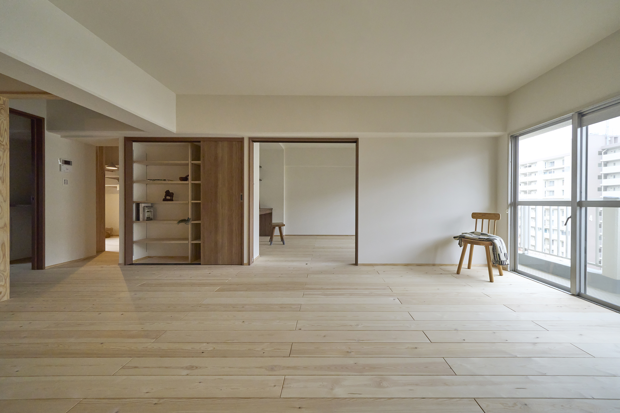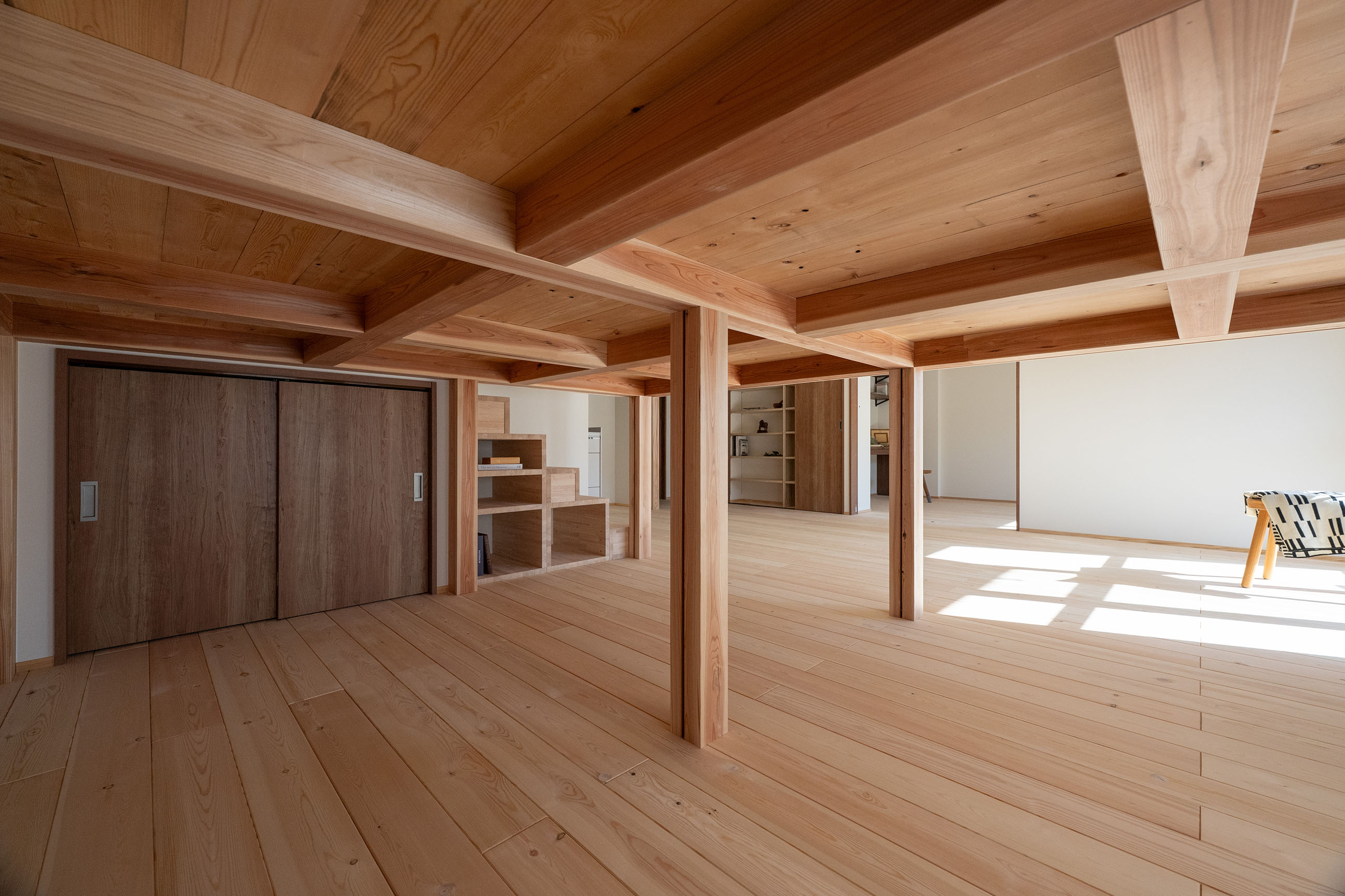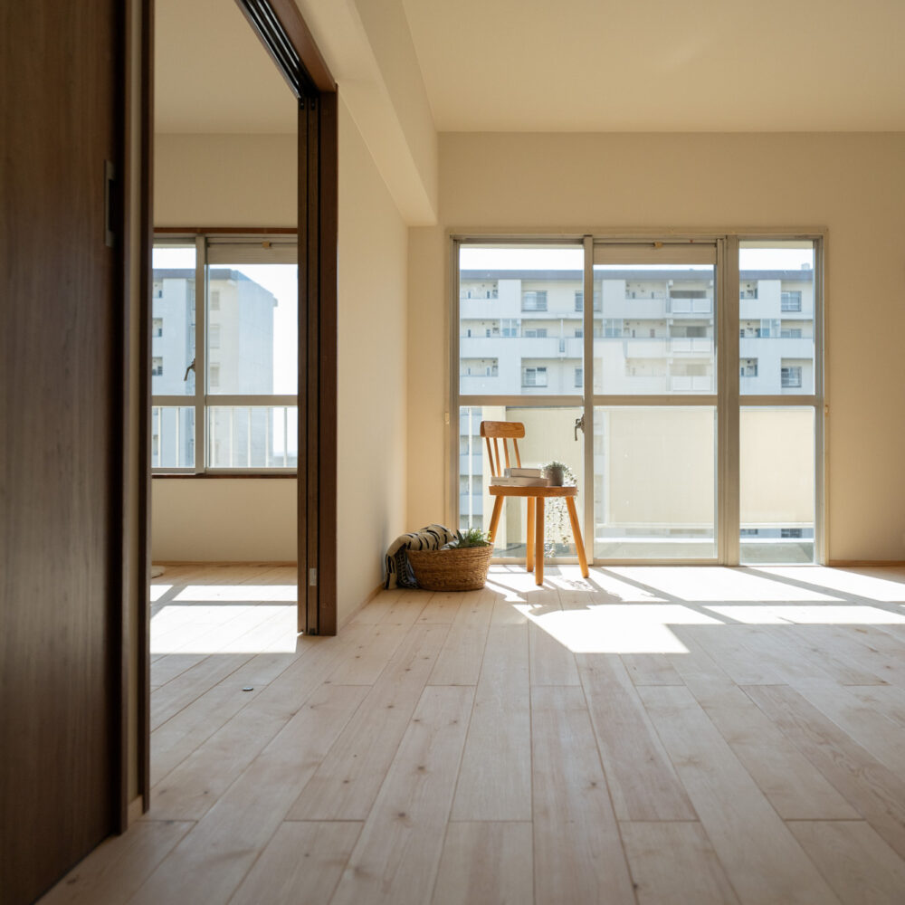 築40年以上のマンションを、自然素材と立体デザインで再生したフルリノベーション。かつての3DKは、広がりを感じる2LDK+ヌック+大容量クローゼットへ。主寝室は、旅先で心に残った“ロフトベッド”のある宿から着想を得て、上をベッドルーム、下をヌックとした立体構成に。格子の手すり越しにリビングを見下ろす視線の抜けが、コンパクトな空間に心地よい広がりを生み出します。 お洋服が好きな施主様のために、北側の一室はまるごとクローゼットに。さらに、子ども部屋の造作デスクやキッチンの吊り戸棚など、シムラが得意とする造作アイテムを随所に設け、機能と美しさを両立。時を重ねた建物に新しいぬくもりを与えています。 注文住宅のシムラが手がけたマンションリノベーション。自然素材や間取りの工夫で自分たち好みの暮らしに合った住まいへと大変貌を遂げました。 思い切った上下段の発想。 旅先で心に残った“ロフトベッド” 建主様が旅先で訪れたホテルで採用されていたロフトベッド。限られた空間を最大限活用するための方法として、とても有効なアイデアでした。上段のベッドは暗くならないようリビングとの仕切りに格子を設置。下段は大容量の収納にもなるヌックスペースに。階段部分はブックシェルフにもなる遊び心の楽しい空間です。