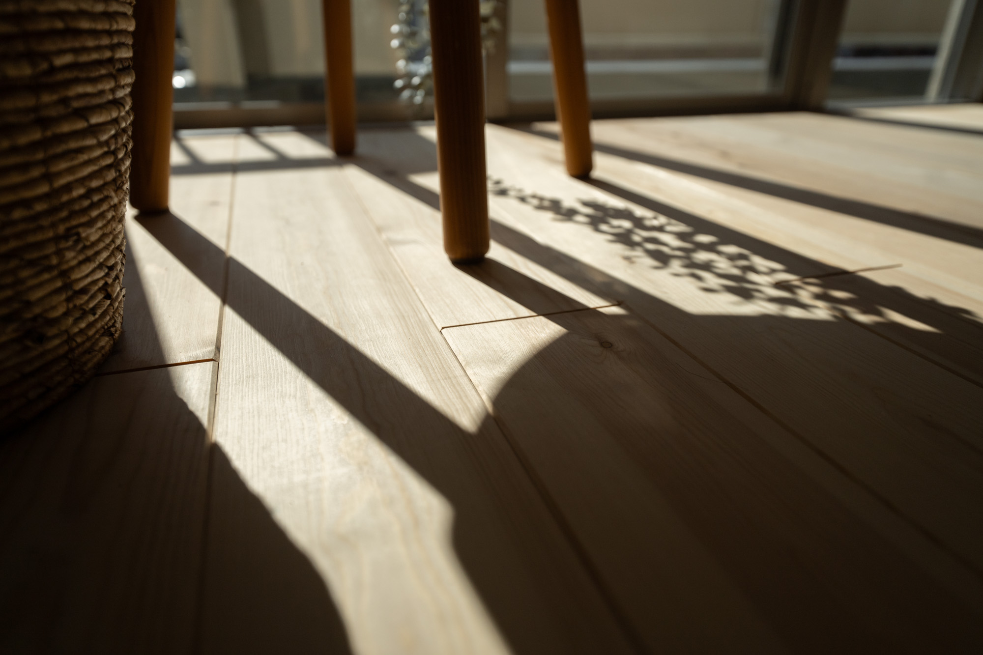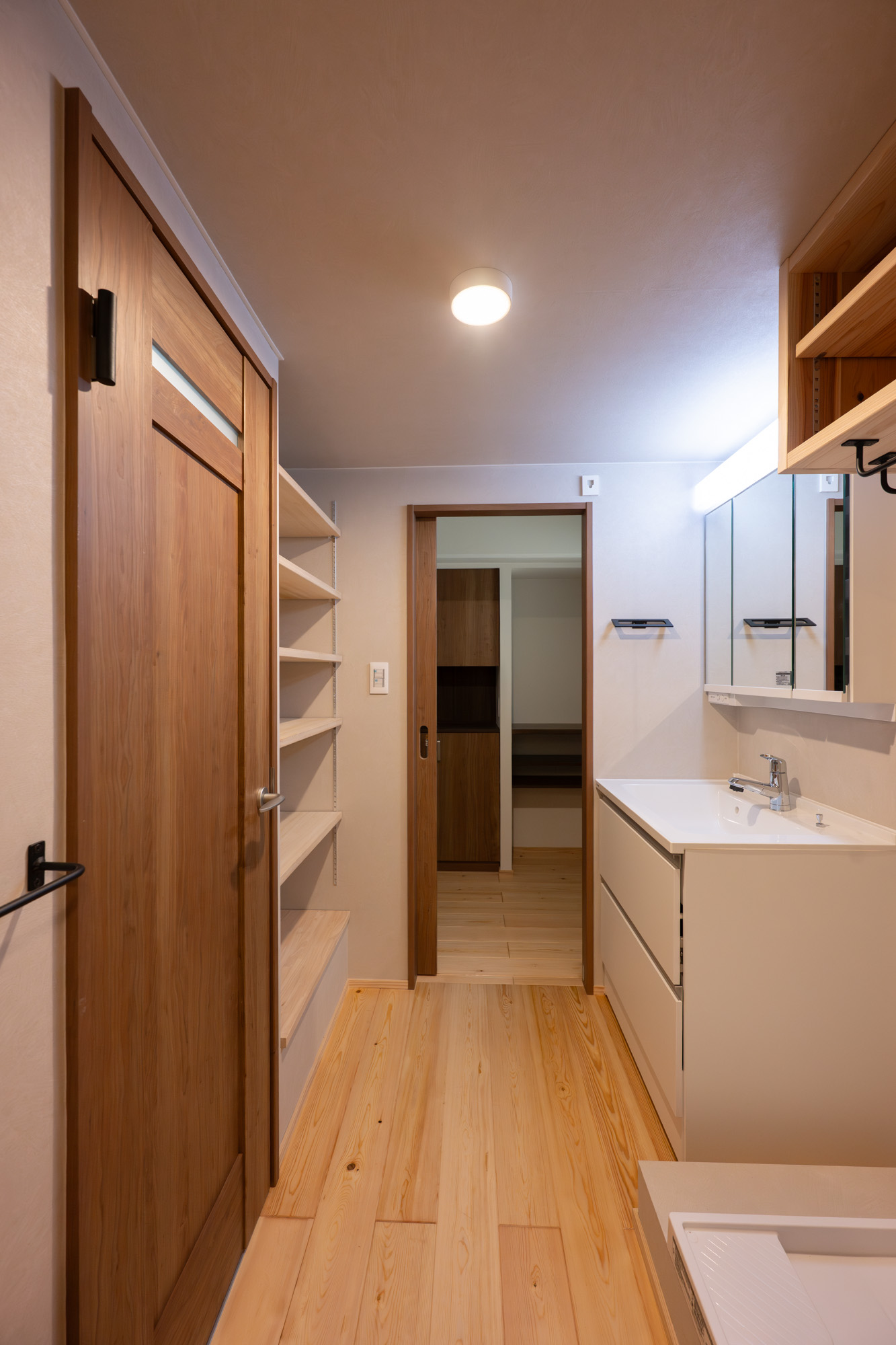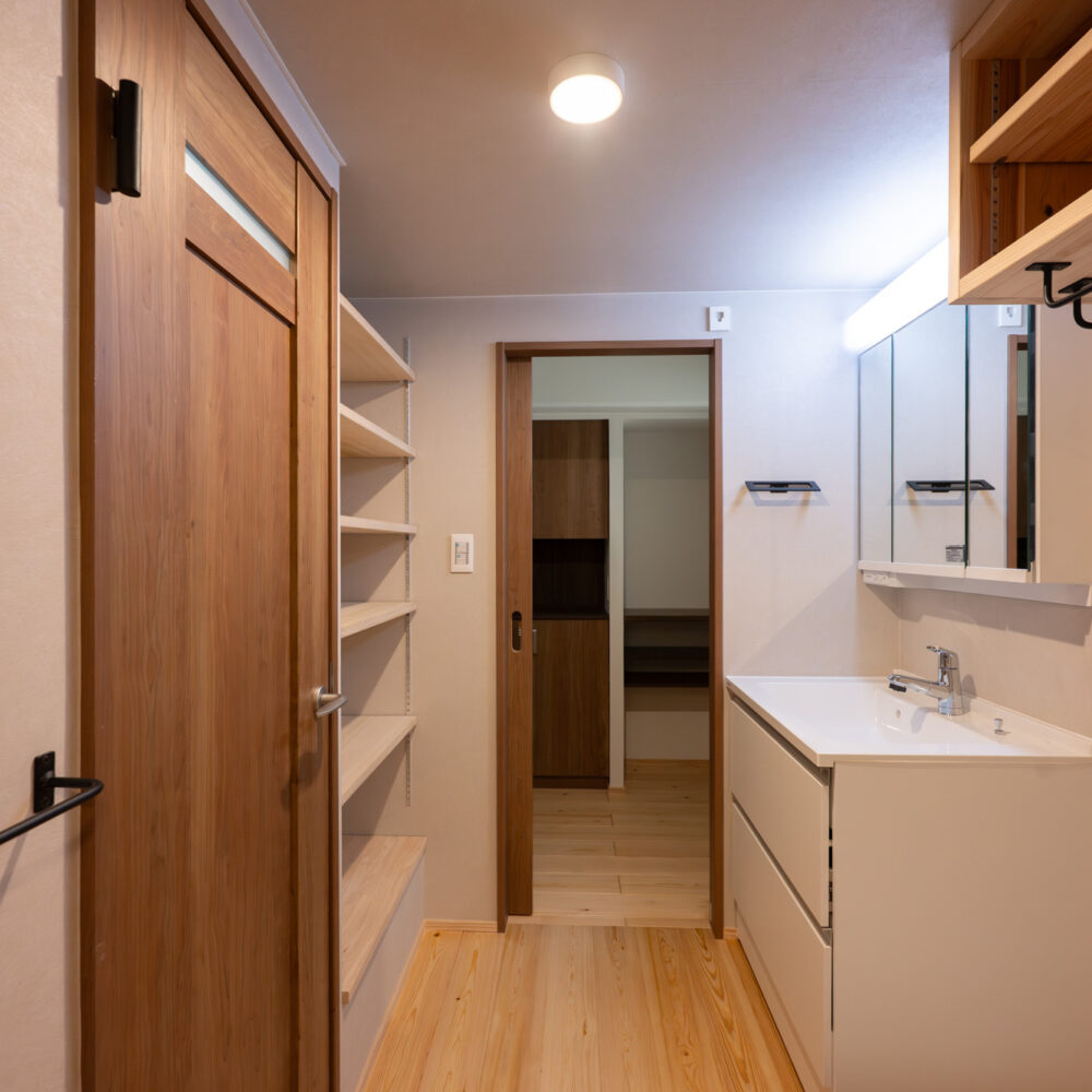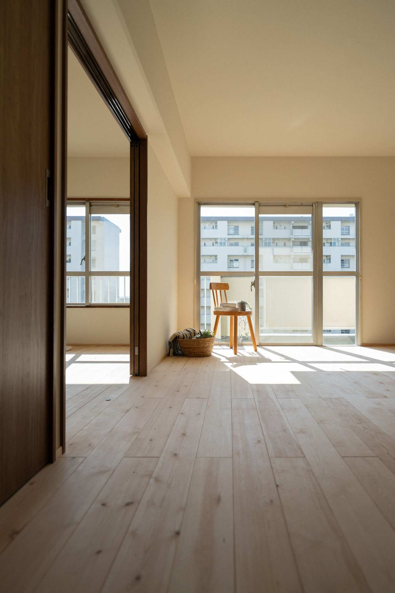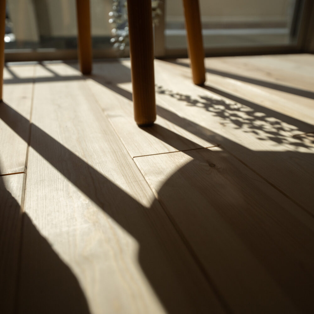築40年以上のマンションを、自然素材と立体デザインで再生したフルリノベーション。かつての3DKは、広がりを感じる2LDK+ヌック+大容量クローゼットへ。主寝室は、旅先で心に残った“ロフトベッド”のある宿から着想を得て、上をベッドルーム、下をヌックとした立体構成に。格子の手すり越しにリビングを見下ろす視線の抜けが、コンパクトな空間に心地よい広がりを生み出します。 お洋服が好きな施主様のために、北側の一室はまるごとクローゼットに。さらに、子ども部屋の造作デスクやキッチンの吊り戸棚など、シムラが得意とする造作アイテムを随所に設け、機能と美しさを両立。時を重ねた建物に新しいぬくもりを与えています。 注文住宅のシムラが手がけたマンションリノベーション。自然素材や間取りの工夫で自分たち好みの暮らしに合った住まいへと大変貌を遂げました。 思い切った上下段の発想。 旅先で心に残った“ロフトベッド” 建主様が旅先で訪れたホテルで採用されていたロフトベッド。限られた空間を最大限活用するための方法として、とても有効なアイデアでした。上段のベッドは暗くならないようリビングとの仕切りに格子を設置。下段は大容量の収納にもなるヌックスペースに。階段部分はブックシェルフにもなる遊び心の楽しい空間です。