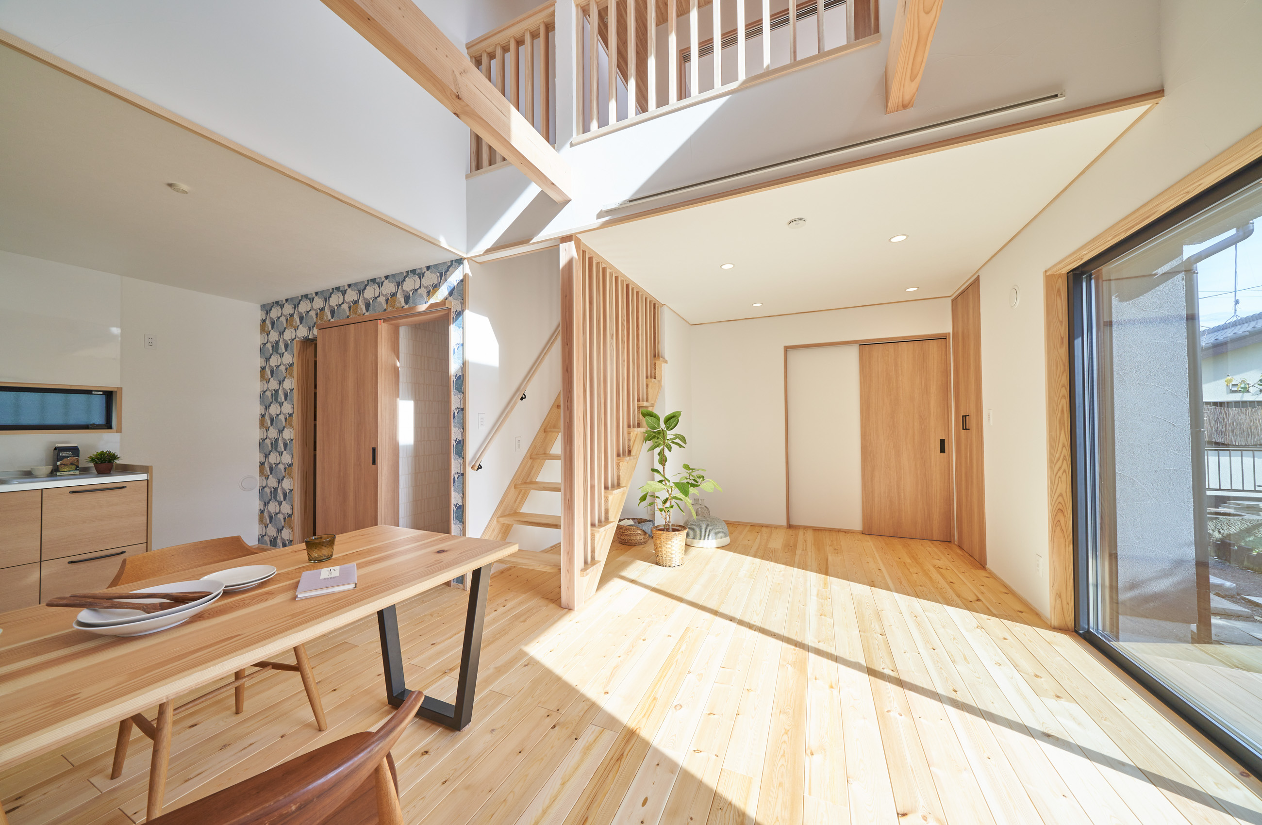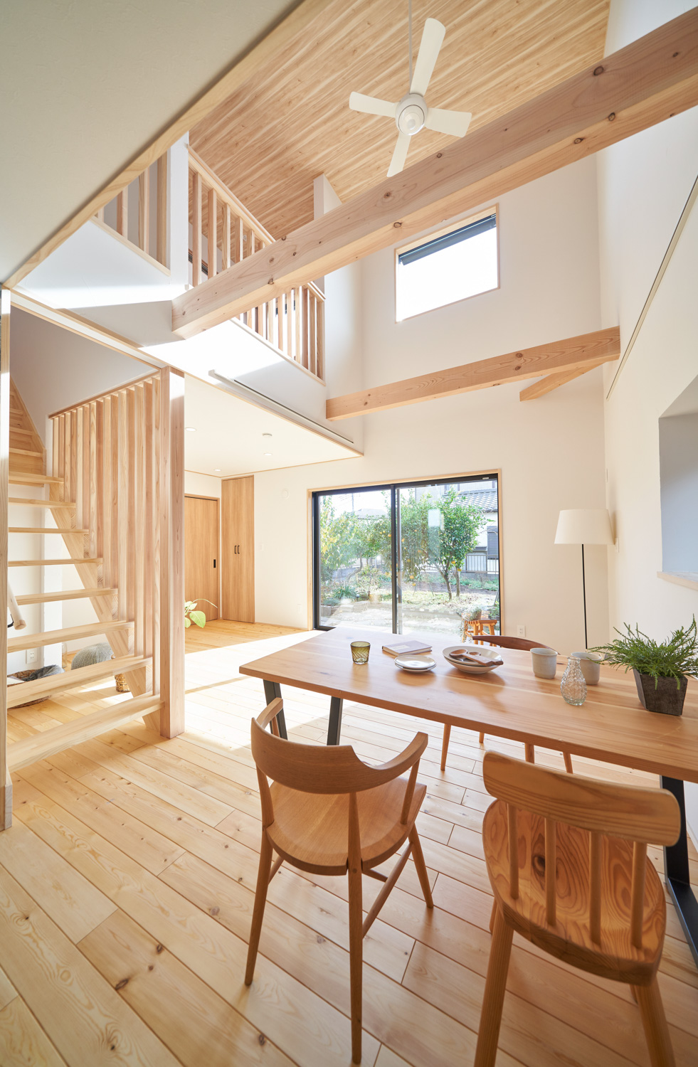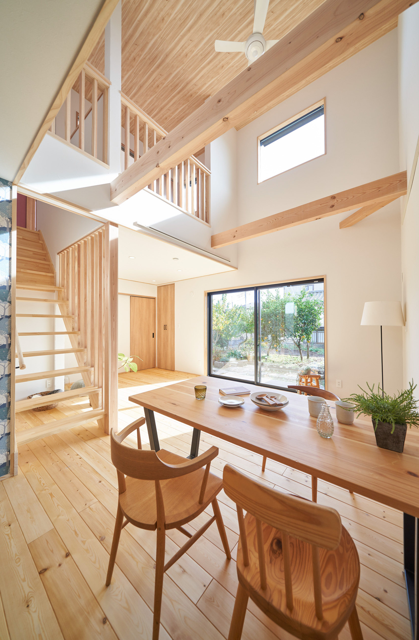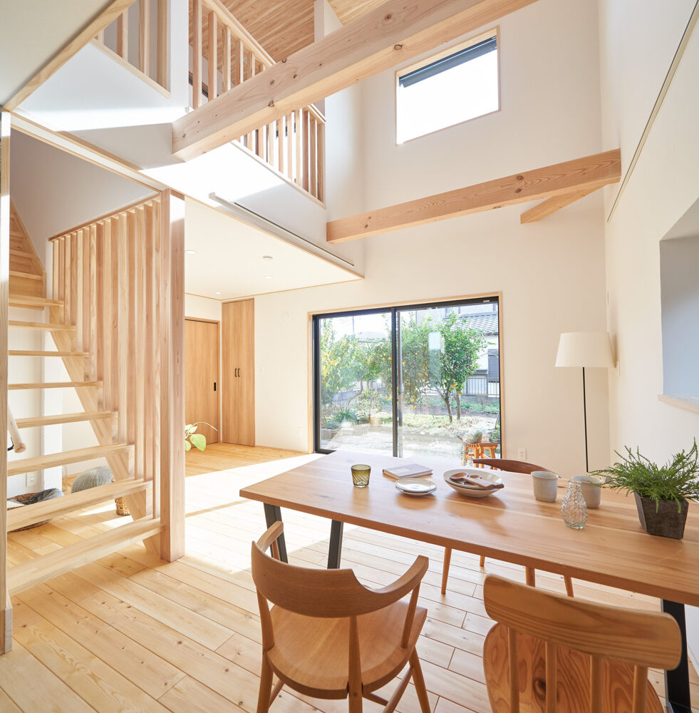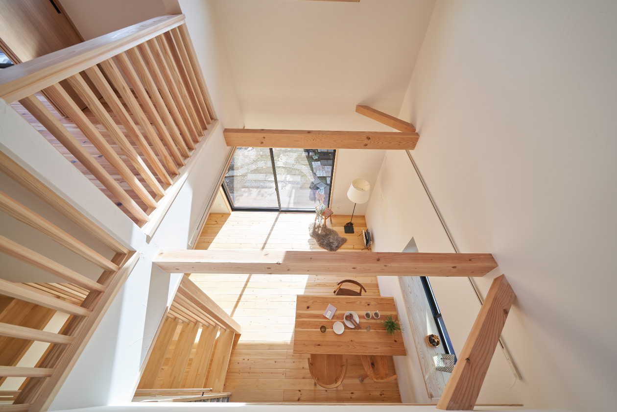 ご両親との思い出が詰まったご実家。年月とともに住みにくさが気になり始めたことをきっかけに、建主様は「リノベーション」という選択でこの家に新たな命を吹き込まれました。 構造だけを残してスケルトンまで解体し、間取りを一から再構築。梁を渡して吹き抜けを設け、断熱材の充填や設備の一新など、性能面も現代の暮らしにしっかり対応。内装には、シムラが得意とする自然素材を随所に採用し、ぬくもりと快適さに満ちた空間へと生まれ変わりました。 1F 大きな吹き抜けを設けた開放的なリビング 2F 無垢な素材
