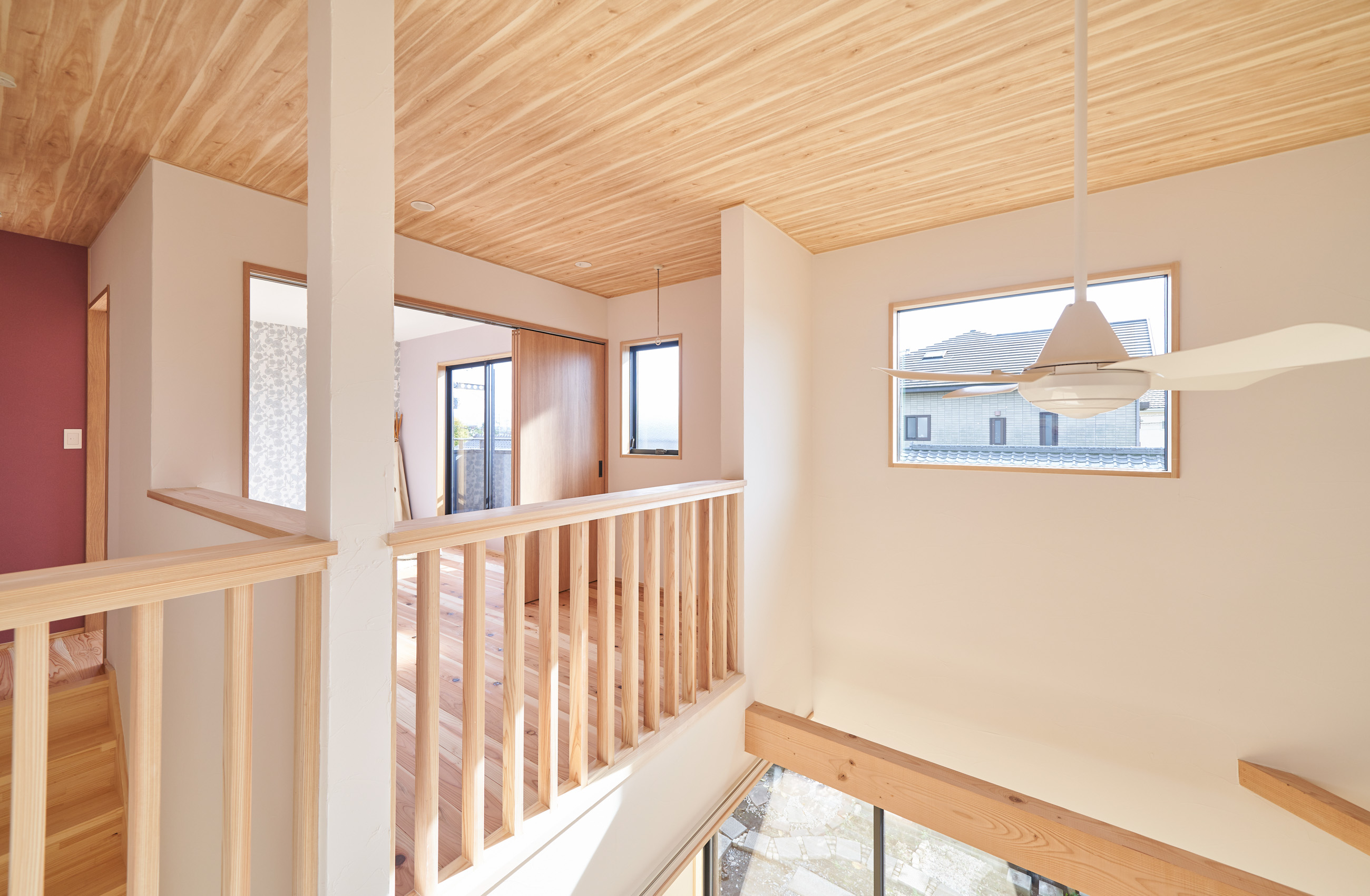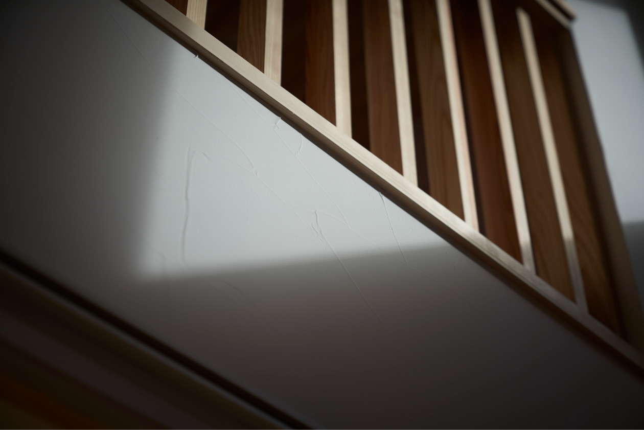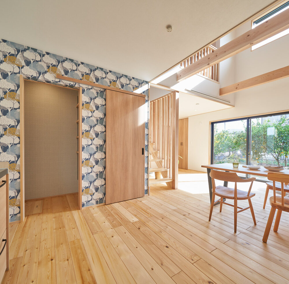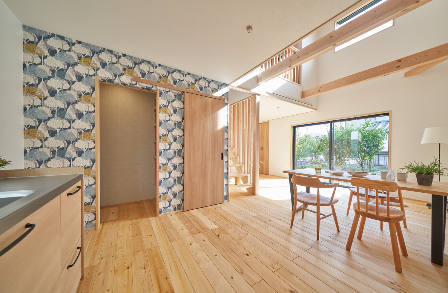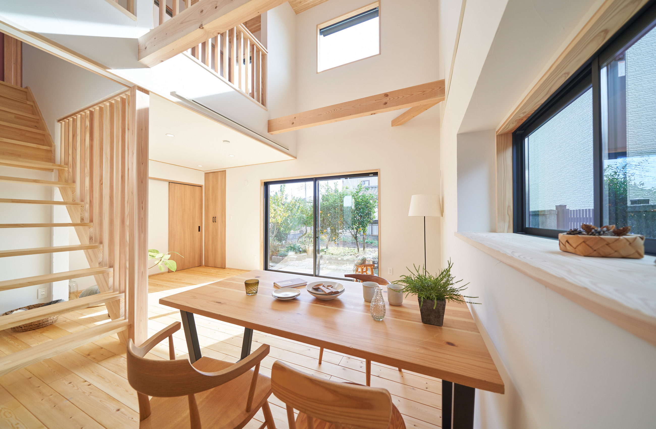 ご両親との思い出が詰まったご実家。年月とともに住みにくさが気になり始めたことをきっかけに、建主様は「リノベーション」という選択でこの家に新たな命を吹き込まれました。 構造だけを残してスケルトンまで解体し、間取りを一から再構築。梁を渡して吹き抜けを設け、断熱材の充填や設備の一新など、性能面も現代の暮らしにしっかり対応。内装には、シムラが得意とする自然素材を随所に採用し、ぬくもりと快適さに満ちた空間へと生まれ変わりました。 1F 大きな吹き抜けを設けた開放的なリビング 2F 無垢な素材
