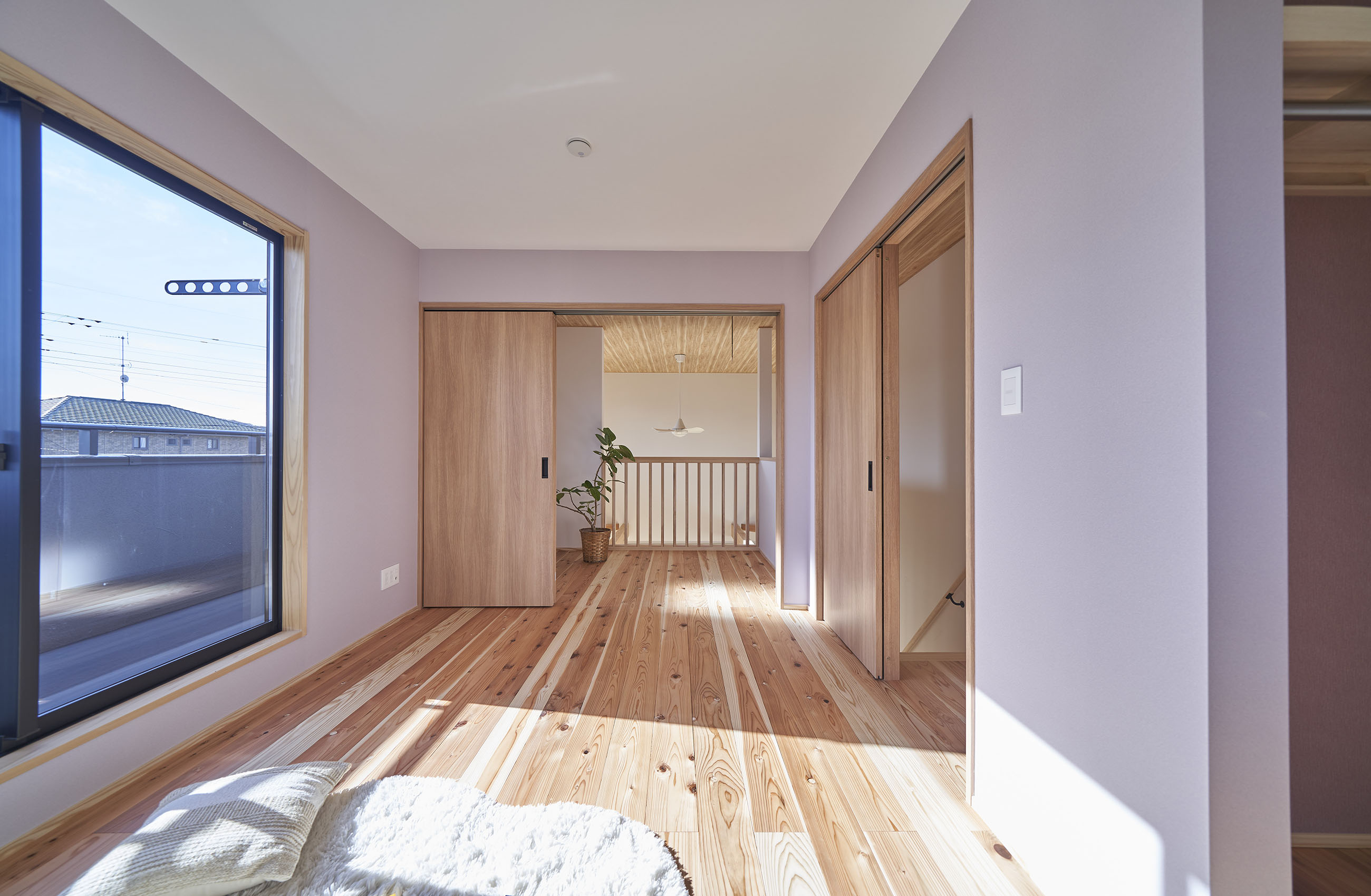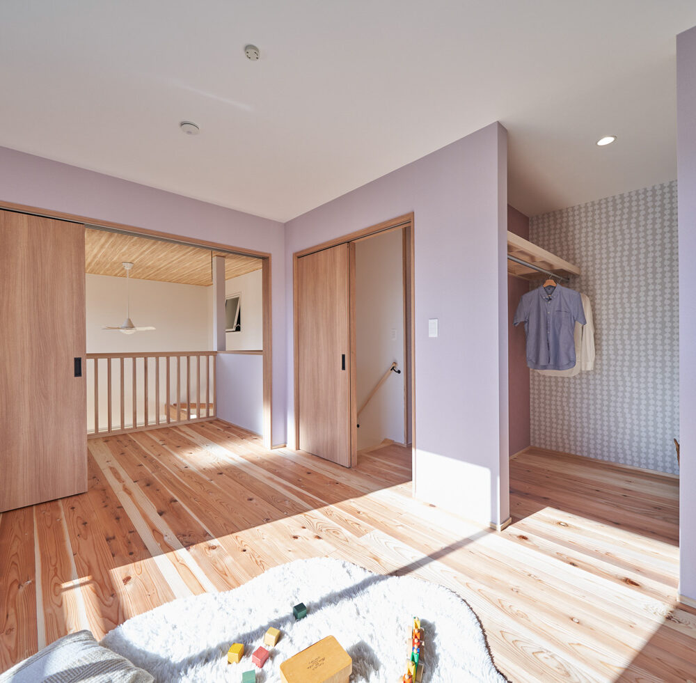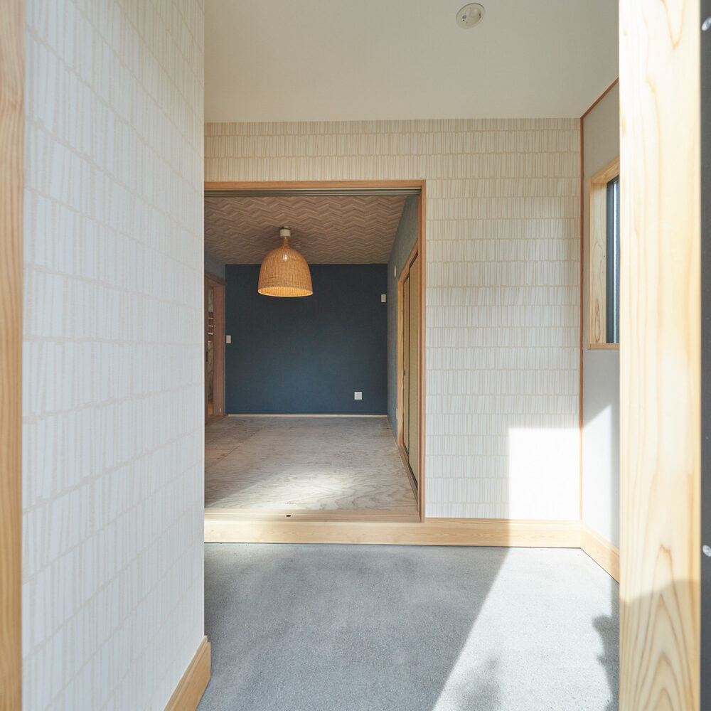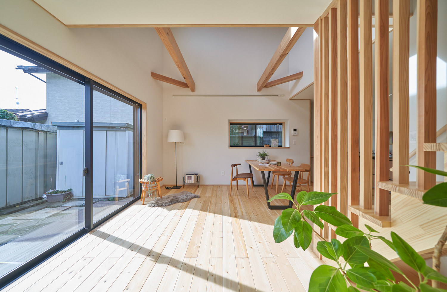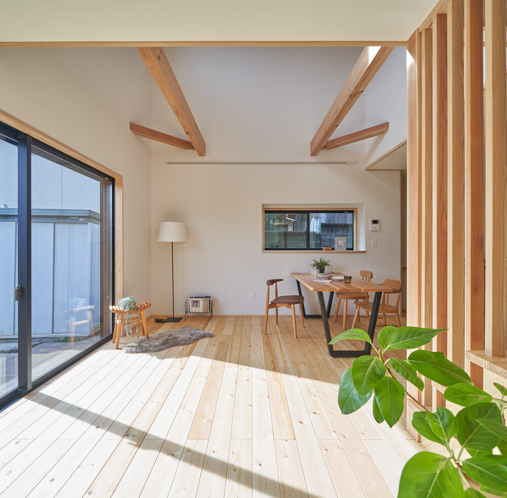 ご両親との思い出が詰まったご実家。年月とともに住みにくさが気になり始めたことをきっかけに、建主様は「リノベーション」という選択でこの家に新たな命を吹き込まれました。 構造だけを残してスケルトンまで解体し、間取りを一から再構築。梁を渡して吹き抜けを設け、断熱材の充填や設備の一新など、性能面も現代の暮らしにしっかり対応。内装には、シムラが得意とする自然素材を随所に採用し、ぬくもりと快適さに満ちた空間へと生まれ変わりました。 1F 大きな吹き抜けを設けた開放的なリビング 2F 無垢な素材